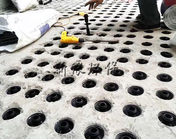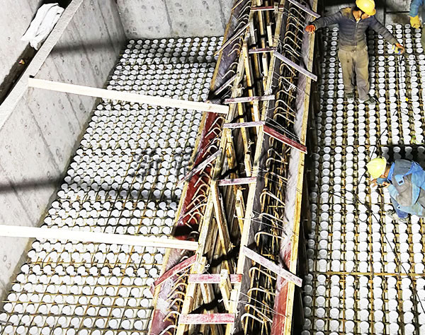 這是因為整體澆筑ABS濾板立體綁扎鋼筋和池壁的預埋鋼筋左右能成網(wǎng)狀結(jié)構和濾梁的預埋鋼筋上下形成立體結(jié)構,極大的提高了濾板整體荷載力和抗沖擊力。這是小塊預制濾板的預埋螺栓無法實現(xiàn)的。在曝氣生物濾池中濾料層的填充高度往往高達4m,因此荷載要高于給水中的濾池。