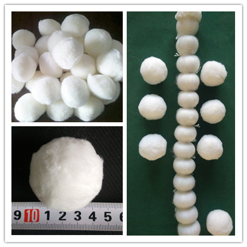 纖維球的制作——纖維球可以根據需求制作成直徑25mm--80mm不同球徑大小的纖維濾球,其材質可采用滌綸,腈綸,丙綸等不同材質,制作工藝大同小異,把長條的長絲經過梳理分成需要的束粗,結扎,裁剪,成型。